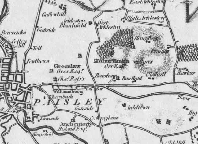 Detail from an 18th century map showing the lands of Ralston (Barshaw, Oldhall,