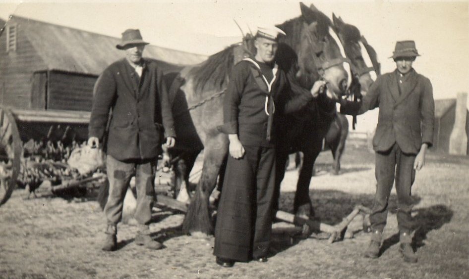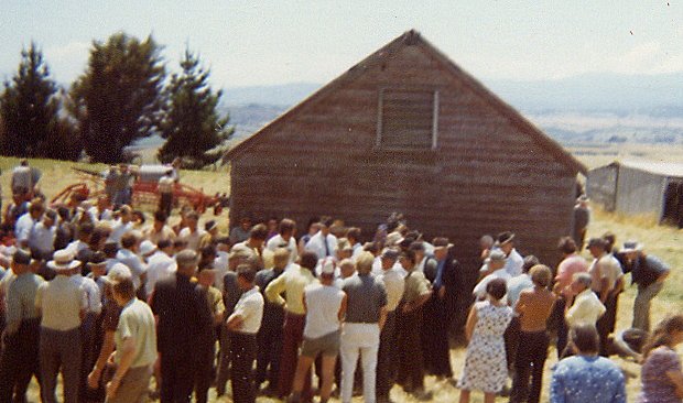 Old barn behind and the Mussett hut on the right. Col Guest flanked by Les and