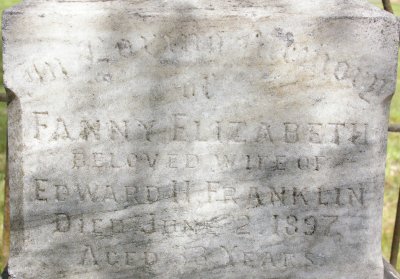 (30/08/1857 - 13/08/1924) 07FRE1 Father : FRANKLIN *James John Mother : COX Mary Ann Siblings: Elizabeth Eliza James Sarah William Mary Francis Frances Married : DAWE Fanny Elizabeth (8/06/1882 at Red Banks, Tasmania) Issue : * Eva Alice |