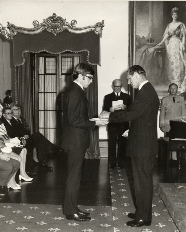 Being presented with Gold Award by H.R.H., Prince Philip,
