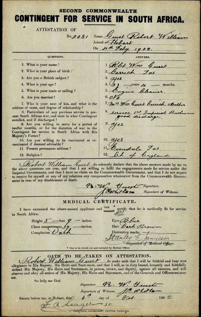 Both of the above photos are from Tasmanians in the Transvaal War, John Bufton,1905 and although the photo on the left is named RG Guest, there is little doubt both photographs are Robert William. Apart from the obvious similarities, Robert William is the only Guest to have served in either unit.