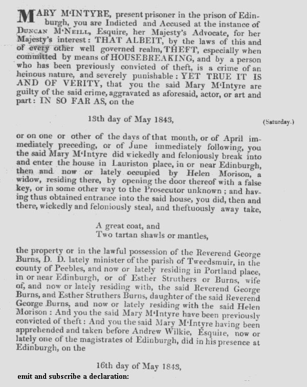 The 17 December 1840, Mary was before the Sheriff's Court charged with theft of cloth, a table cover, tartan shawls, a blanket, a silk handkerchief, a kettle, a bed cover and cotton handkerchiefs. The crime was aggravated by having been committed by means of housebreaking and prior convictions. Mary was sentenced to 9 months in the Prison of Edinburgh.