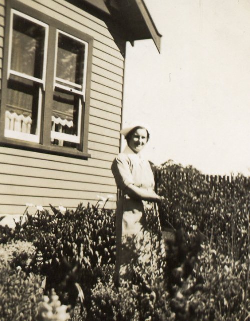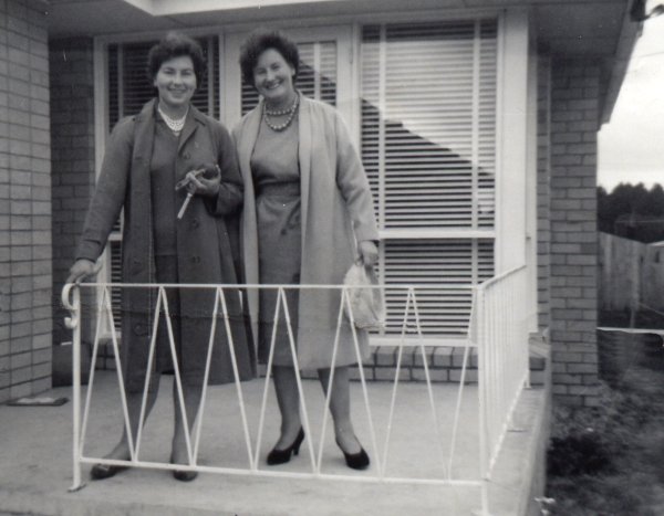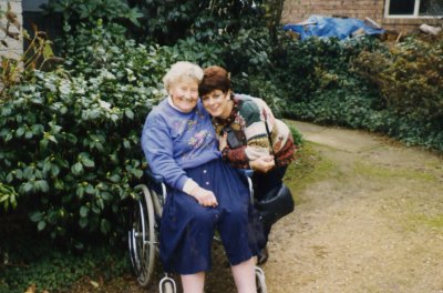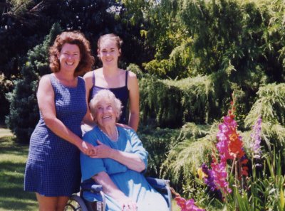 In her front yard at Rose Hill, Evandale. Niece Lynne Christie is left in the