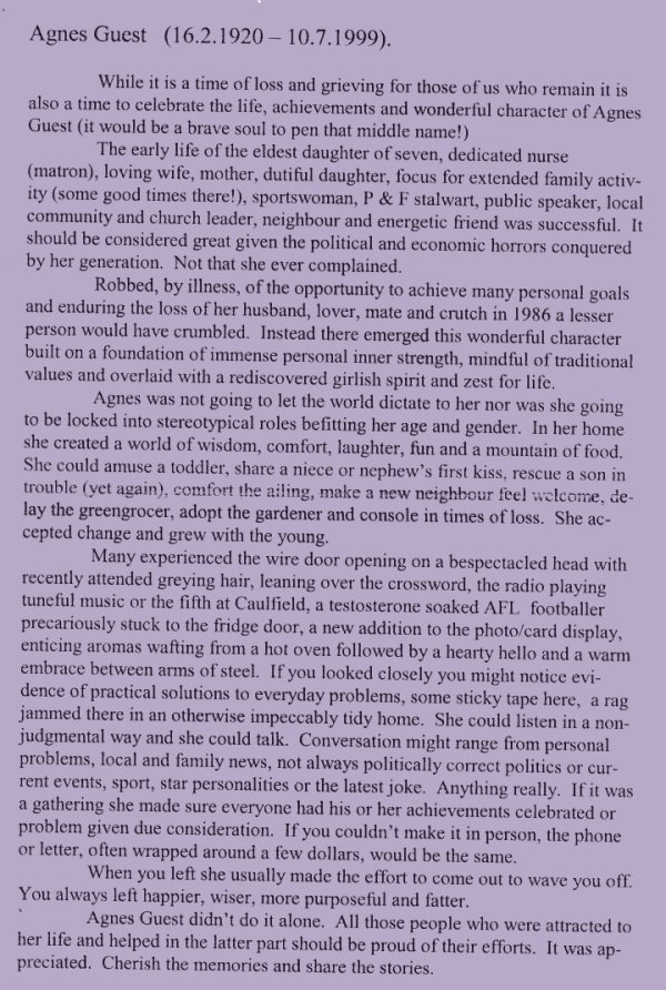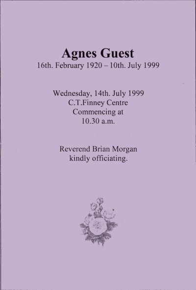(16/02/1920 - 10/07/1999) 09RAA0 Father : RALSTON * Gordon Mother : Elcocks Flora (Elcox) Siblings: Winston Dorothy Flora-Joyce (Polly) Ann Coral Heather Married : GUEST Donald Edward (29/4/1943 aged 23 - Deloraine) Issue : Peter Michael Phillip |