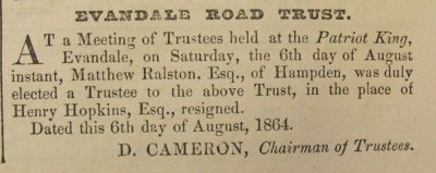 Nile River District, Morven (Evandale). This appointment was approved in 1833.